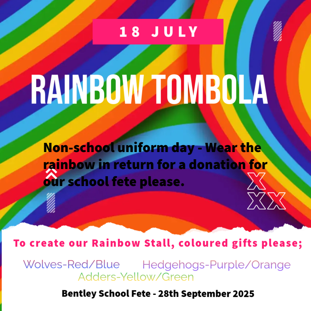 PTA needs your help with donations for the school fete. Please support the rainbow tombola, colourful items such as toys, books, toiletries, teddies or sweets would be appreciated. See Poster attached.