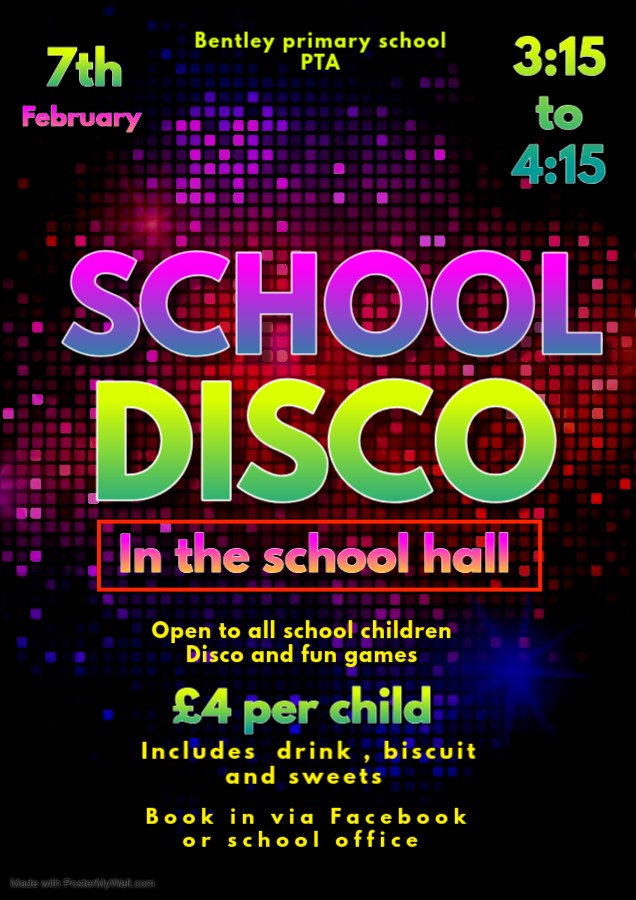 Uniform order Please see the attached form. Deadline is Friday 7th February. Please ensure that payment is made at the same time as sending in the order form. We do need a completed order form please to be able to place your order. Coffee & Chat Next week is Children's Mental Health Week, we have lots planned in school including a visit from the Mental Health Support Team who will be presenting an assembly and workshop to the children, followed by a coffee and chat session for parents from 2:30pm onwards. There is no need to pre-book, just turn up on the day. Assessments Please see this link containing information for parents from the government about statutory and optional assessments. This is relevant for Year 6 families. Seeds The school has kindly been donated some seeds from Thompson & Morgan. If you would like any packets these will be available after school from Monday in exchange for a small donation which will go towards the development of our Nurture area. PTA Disco-School Disco See attached poster. PLEASE note there is NO quiet room, we will only be in the school hall for disco music & fun games. To book your child in please either comment on the Facebook post or email into school office. Payment either Bacs Ref - SD & child’s name Bentley Primary PTA Sort code 30-99-50 Account number 65910268 OR Cash in a named envelope into school office. Half term activities Pease see flyers regarding any half-term events we have been advised about. |