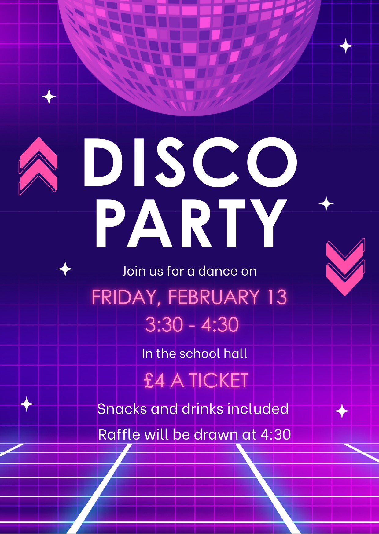 Valentines Disco Raffle Tickets - the PTA will be holding a Valentines Day Disco after school on Friday 13th February (see posters attached). Tickets can be purchased through the PTA. This will be a non uniform day in exchange for a Pink or Red donation for a raffle to be held at the Disco. Raffle tickets will be on sale each day after school next week, sold by KS2 children. Tickets cost 50p each so please bring exact cash with you to purchase tickets as money raised is used to subsidise school trips.