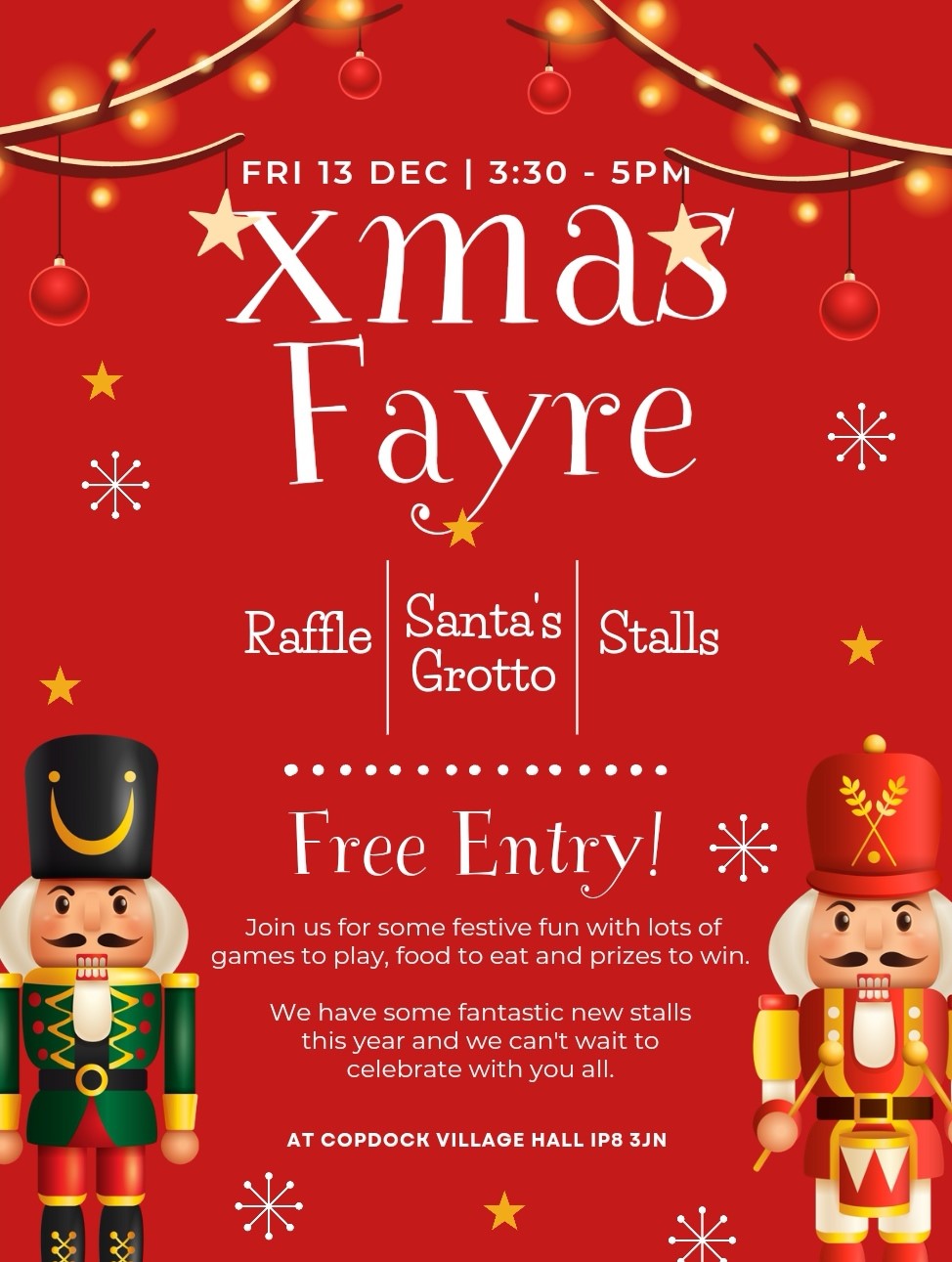 PTA Christmas Events - thank you to everyone who attended the Wreath Night this week - the PTA raised over £400 at this event. They continue the Christmassy theme with a Santa Run this weekend - make sure you get your tickets today to ensure your medal is ready & waiting for you - if anyone would like to sponsor the race, please get in touch. Next Friday sees the Christmas Fayre. Children need to be collected from school as usual at the end of the day and taken to the Village Hall if you are attending the Fayre. Please note, the hot chocolate stall will be stationed at the Christmas Fayre next Friday rather than the playground where it will be today. The Christmas Fayre is being held at Copdock Village Hall from 3:30-5pm. We have some new stall ideas and a visit from the man in red. If you're able to help on a stall please let us know. Please see advertising attached for more details.