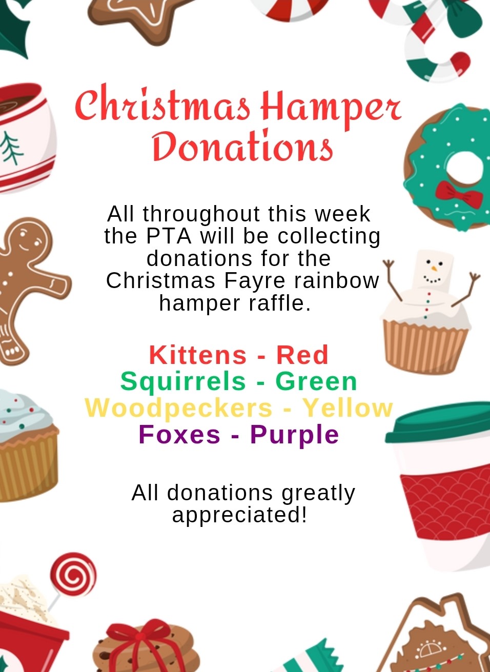 Hamper Donations - thank you to everyone who donated this week towards the PTA Christmas Hampers. Donations can still be made this afternoon. In order to win one, you will need to purchase raffle tickets. These will be sent home with your child today. Please return monies and stubs to school by next Thursday 12th. They can also be returned to the Fayre on the day. Please send any unsold tickets back to school to be reallocated. If you would like more tickets, please let either the office or the PTA know. Please see attached poster.