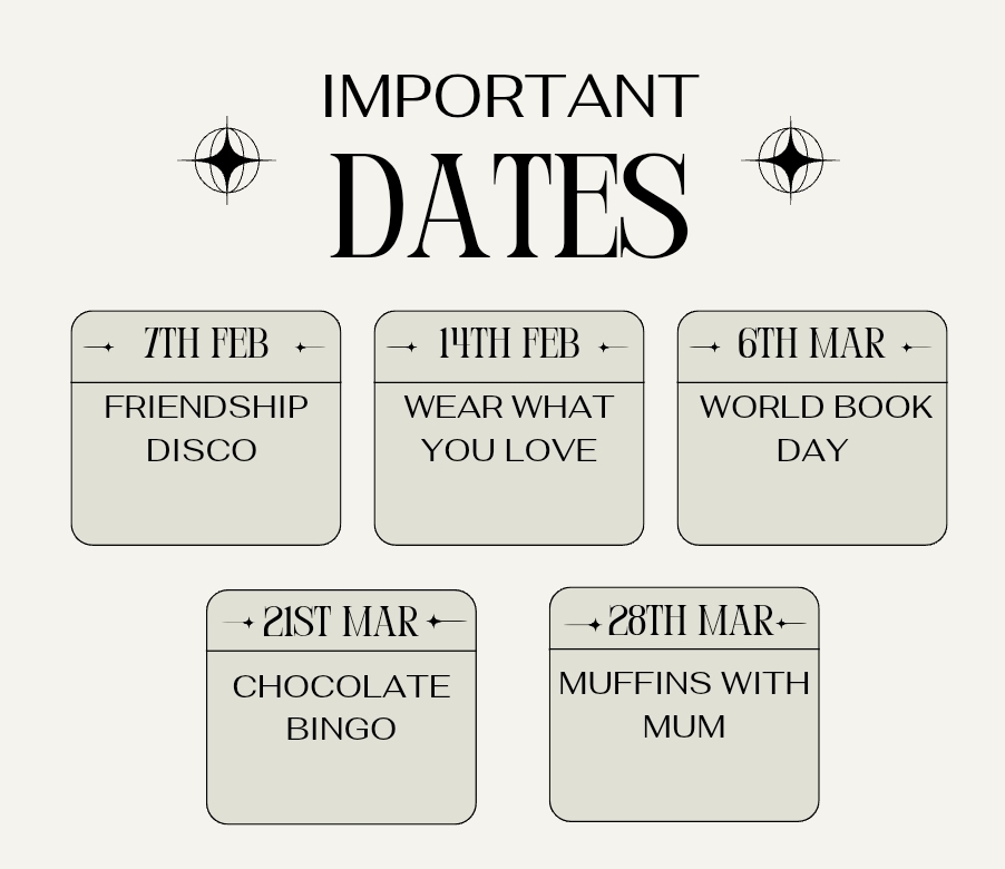 Information to ShareAttendance - our current attendance as a school is 97.7% - the national average is 94.8% and the LA average 94.9% - we are above average, well done! Online Safety Webinars for Parents - please see the website here for details of online safety events throughout the year. They are free to attend. We will be marking Safer Internet Day in school on 11th February, reminding children about things to look out for and the importance of following our acceptable use policy to stay safe online. Remind yourself about these by locating them on the policy page. Uniform Reminders - as per the uniform policy found on the website here, please note, if your child wears earrings, they must be plain studs and removed for PE or swimming. Other styles of earrings are not allowed on health and safety grounds. A new uniform order will be available on next week's newsletter. Packed Lunch Policy - we are looking for parents who would like to form part of a working party looking into the creation of a packed lunch policy. If you would like to be involved, please contact the office. Assessments - please see this link containing information for parents from the government about statutory and optional assessments. This is relevant for Year 6 families. IPSSA Cross Country - if any children in years 4, 5 or 6 would be interested in running the annual cross country event at the Royal Hospital School, they need to let us know. However, participation is dependant on parental support. The event is to be held on Wednesday 2nd April, parents need to arrange transport for their child to and from the event - arrival at 1pm, estimated completion time is 3:30pm - pupils are expected to stay for the duration of the event to support their teammates. Year 4s will need to be able to run 1500m, Foxes need to be able to run 2200m - at a sustainable pace for the race distance. Please take all of this into consideration before putting your name forward. Please let the office know by Friday 31st. Seeds - seeds will continue to be available for purchase @ 50p per pack after school next week. Please pop your money in the honesty box. If the weather is wet, they will be available just inside the door to the office. PTA Events - please see the attached posters for upcoming PTA events. In summary, there will be a Friendship Disco held on Friday 7th February 3:45-4:45pm at the Village Hall. Those attending the disco can come into school in their disco clothing as long as it is appropriate for school - especially footwear for walking to the hall. If your child is attending the disco, you MUST let the office know by Thursday 6th that they need to be walked up after school - this is to ensure we have the correct ratios for taking the children there. Join us for lots of fun, games and dancing with friends. Tickets are just £3.50 each including a snack and unlimited drinks! Please speak to a PTA member to purchase your tickets. Looking further ahead, there will be a dress down day for all on Friday 14th February with the theme of Wear What You Love - in exchange for donations towards the Easter Chocolate Hamper or Mother's Day Hamper - more details next week. |
