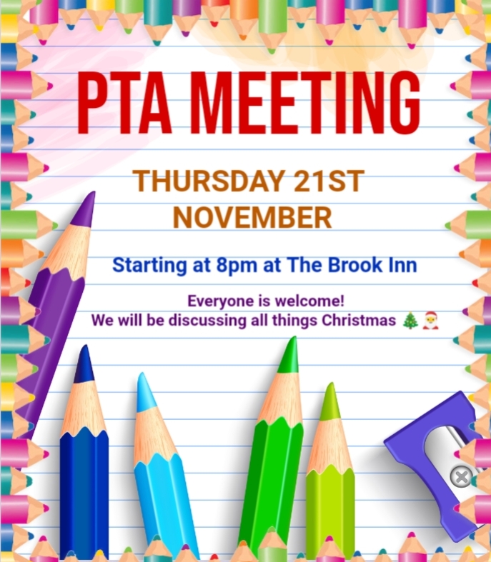 PTA Meeting - please note this date has changed from Monday 11th November to Thursday 21st November at 8pm at The Brook Inn. Please see attached flyers for details of events coming up.